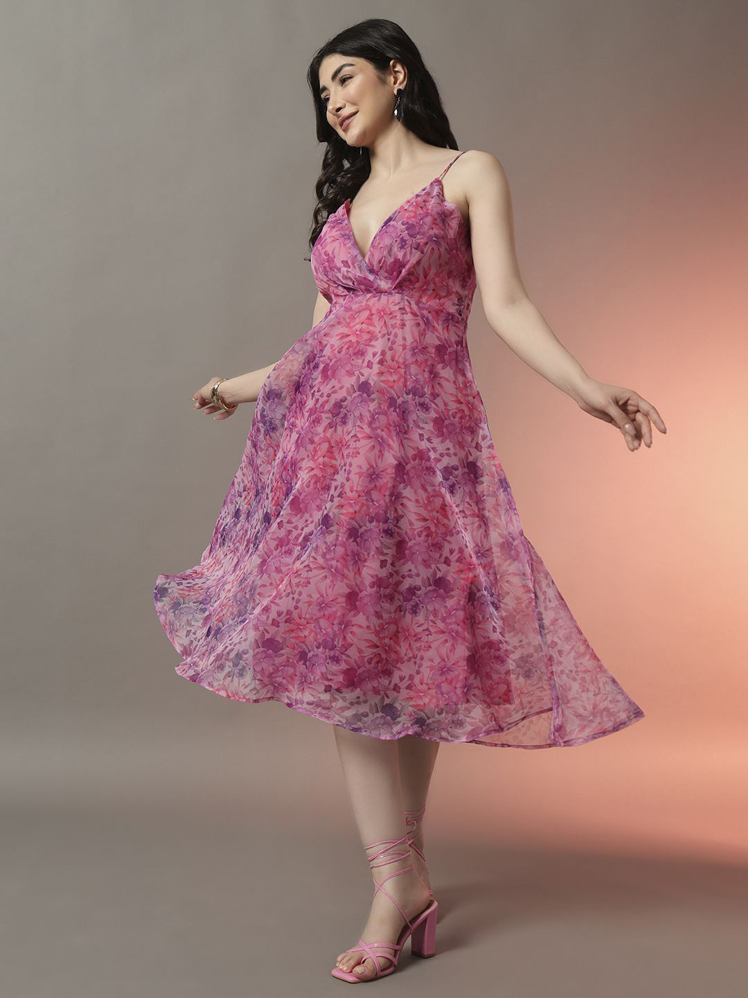 Fit & flare midi dresses with floral prints and delicate shoulder straps for a fresh look.